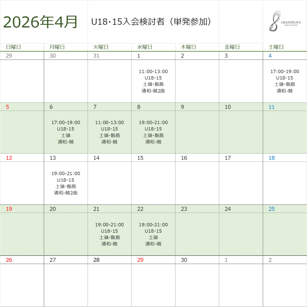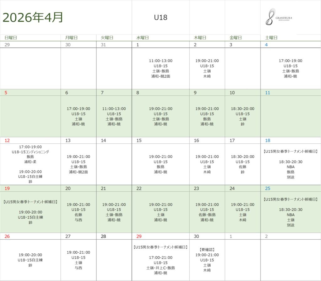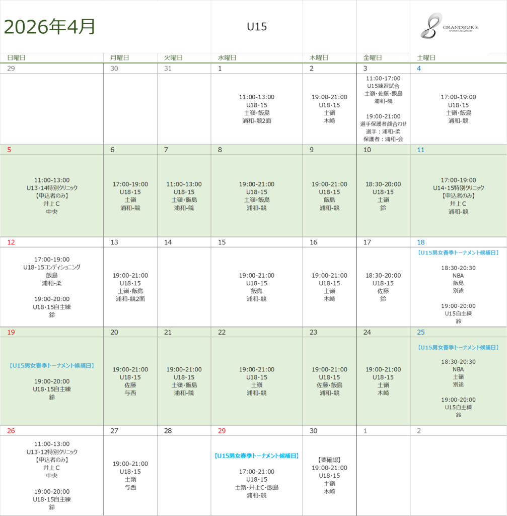 U15男女トーナメントの候補日は仮の予定です。例年5月連休まで候補日となっていますので、土日含め、休日の予定は空けるようお願いいたします。日程の変更、確定についてはTeamHubの情報が最新となりますのでご確認をお願いいたします。