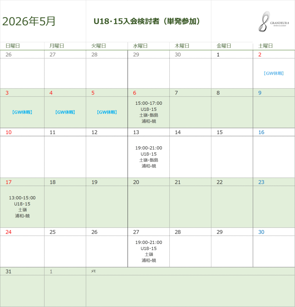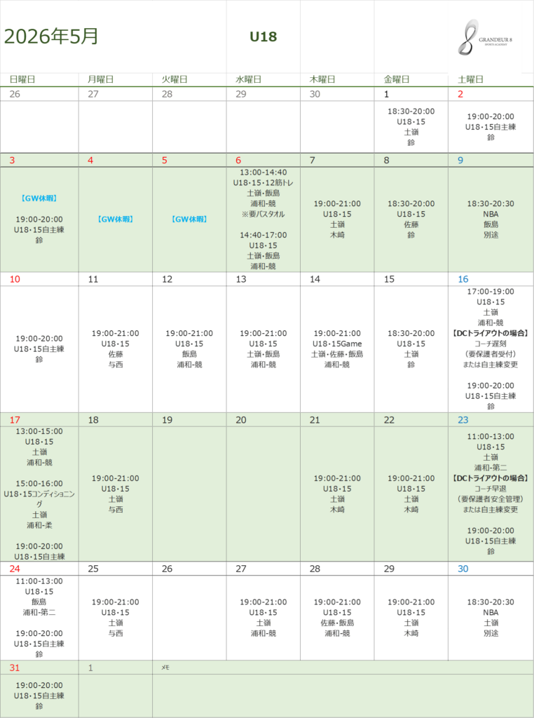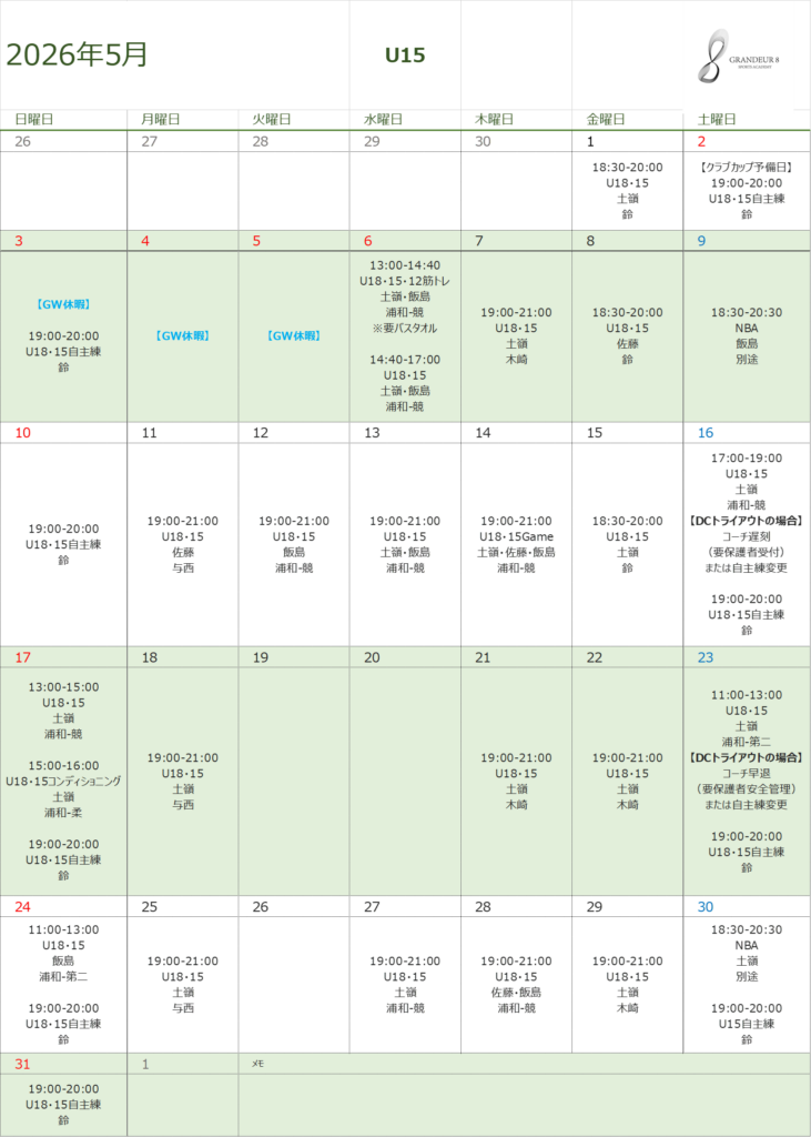 U15男女クラブカップの候補日は仮の予定です。土日含め、休日の予定は空けるようお願いいたします。日程の変更、確定についてはTeamHubの情報が最新となりますのでご確認をお願いいたします。